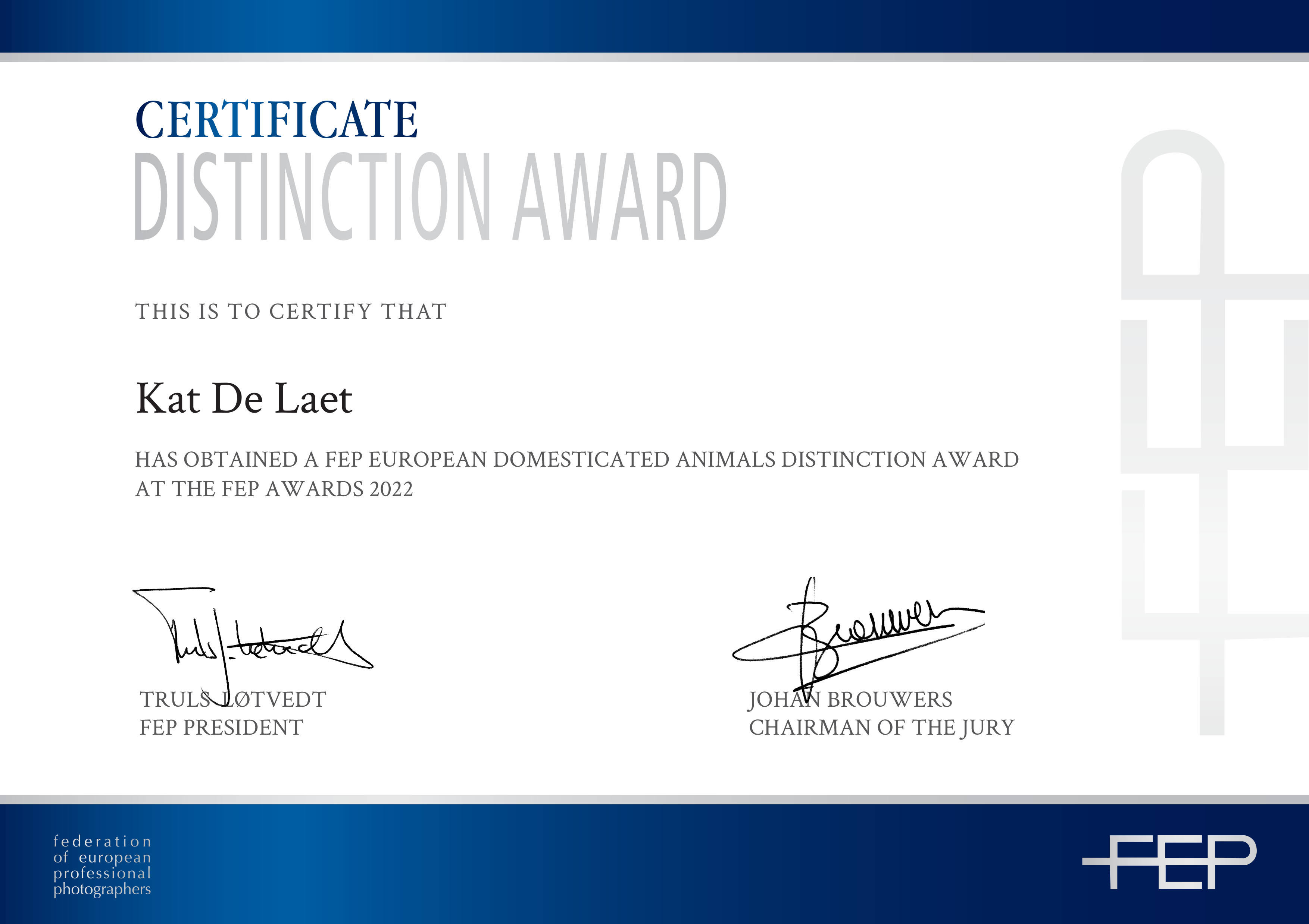 2022 – finalist European FEP Awards category ‘Domesticated Animals’, 1 Distinction award & 1 merit award